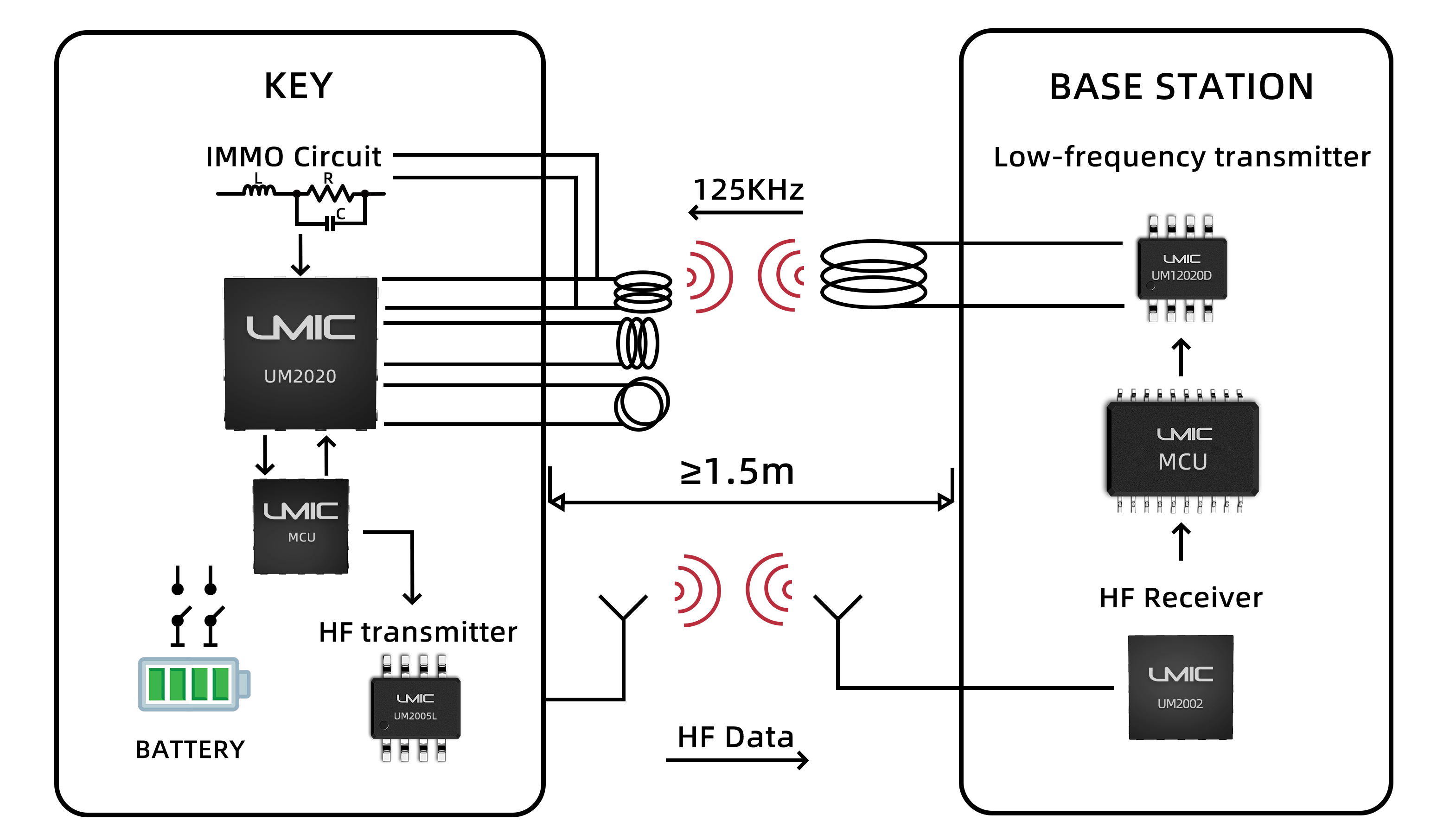 廣芯微基于低功耗高性能低頻接收SoC芯片UM2082F08、FSK(OOK)發(fā)射芯片UM2001(或2.4G發(fā)射芯片UM2052)組成的鑰匙方案,以及采用廣芯微低功耗32位MCU芯片UM3213A、FSK(OOK)接收芯片UM2002(或2.4G接收芯片UM2052)組成基站發(fā)射端,構成完整PKE解決方案。