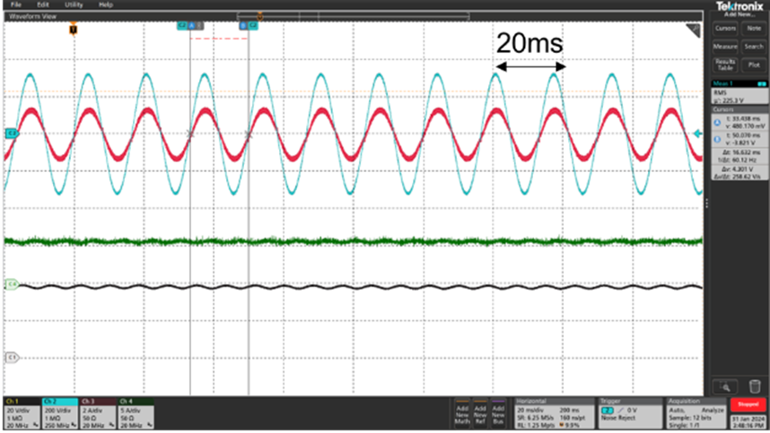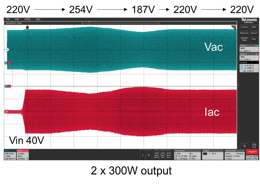 下圖是微型逆變器工作在187 – 254V電網(wǎng)電壓下2 x 300W功率輸出的波形,微型逆變器可以在不同的電網(wǎng)電壓下進(jìn)行可靠工作。