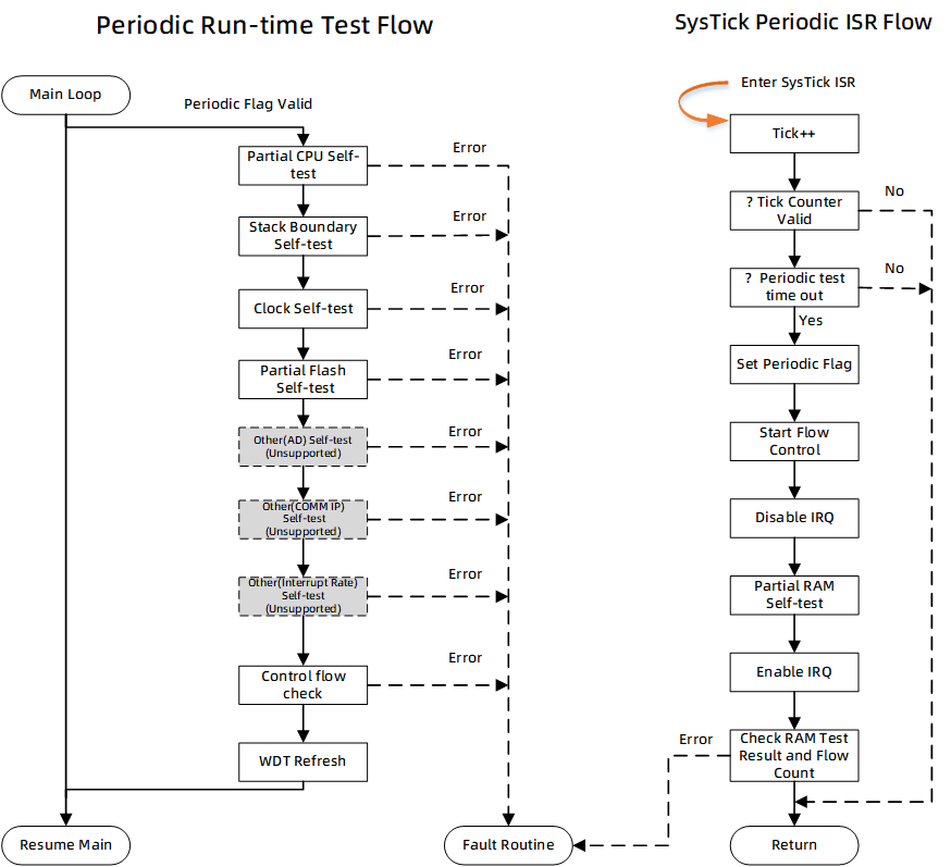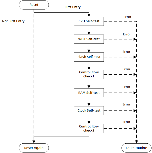 運行時自檢項:CPU部分寄存器自檢、Flash分塊自檢、RAM分塊自檢、棧上溢/下溢檢測,系統(tǒng)時鐘和中斷自檢。部分檢測功能可通過修改宏定義值進行開關(guān)和配置。