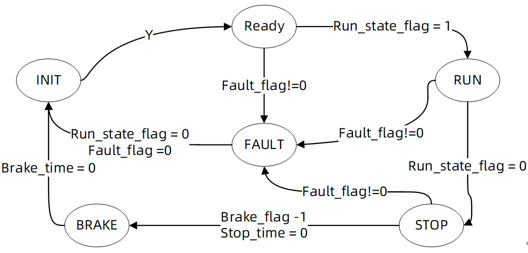 電機(jī)運(yùn)行狀態(tài)分為 INIT、 READY、 RUN 、STOP、 BRAKE、 FAULT 6個狀態(tài):