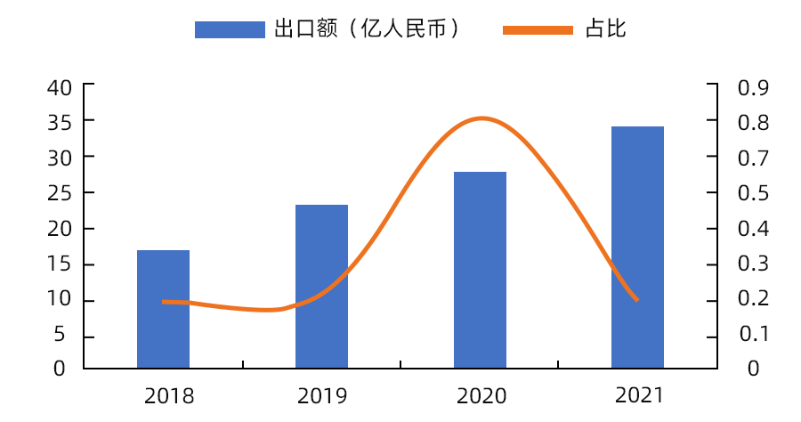 圖一 2018-21年中國出口至美國割草機(jī)情況(億元,%)