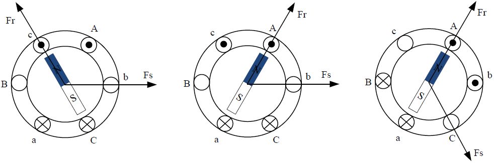 如下圖 ,F(xiàn)s為定子合成磁動勢,F(xiàn)r為轉(zhuǎn)子磁動勢,由下圖可知定子合成磁勢與轉(zhuǎn)子磁動勢往往在60°到120°之間,但是這并不是最大輸出扭矩的角度,根據(jù)磁場力矩最大原理,F(xiàn)s和Fr為90°時(shí)扭矩輸出最大。