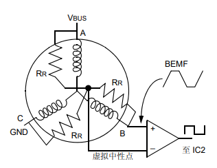 比較器檢測反電勢方法:BEMF 電壓與電機(jī)中性點(diǎn)電壓比較,可以通過使用可變閾值電壓點(diǎn)檢測過零事件。該可變電壓就是電機(jī)的中性點(diǎn)。大多數(shù)BLDC 電機(jī)的中性點(diǎn)不會用導(dǎo)線引出。但可以用電阻網(wǎng)絡(luò)來構(gòu)造中性點(diǎn)。將三個電阻(RR)的一端分別與電機(jī)的三相繞組并聯(lián),另一端連在一起以產(chǎn)生一個虛擬中性點(diǎn),如右圖所示: