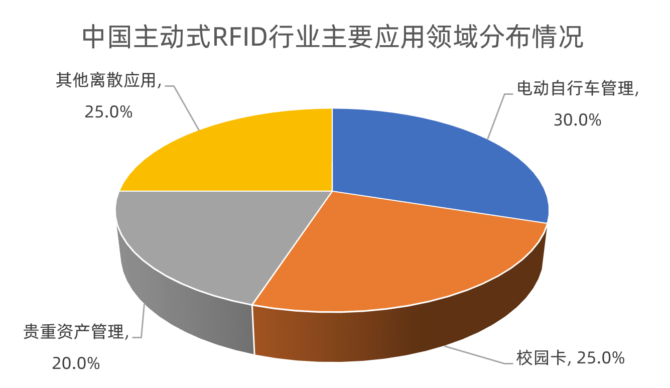 根據(jù)物聯(lián)傳媒公布的數(shù)據(jù)顯示,近幾年我國主動(dòng)式RFID整體出貨量每年大約3000萬,市場(chǎng)產(chǎn)值為數(shù)十億元,其最主要的應(yīng)用有校園卡、電動(dòng)自行車管理、貴重資產(chǎn)管理以及其他的零散應(yīng)用,尤其校園卡應(yīng)用與電動(dòng)自行車管理是有源RFID最為集中的應(yīng)用場(chǎng)景。根據(jù)物聯(lián)傳媒發(fā)布的數(shù)據(jù)顯示,在主動(dòng)式RFID主要應(yīng)用領(lǐng)域中,電動(dòng)自行車管理領(lǐng)域應(yīng)用占比達(dá)30%,校園卡應(yīng)用占比為25%,貴重資產(chǎn)管理領(lǐng)域應(yīng)用占比為20%。