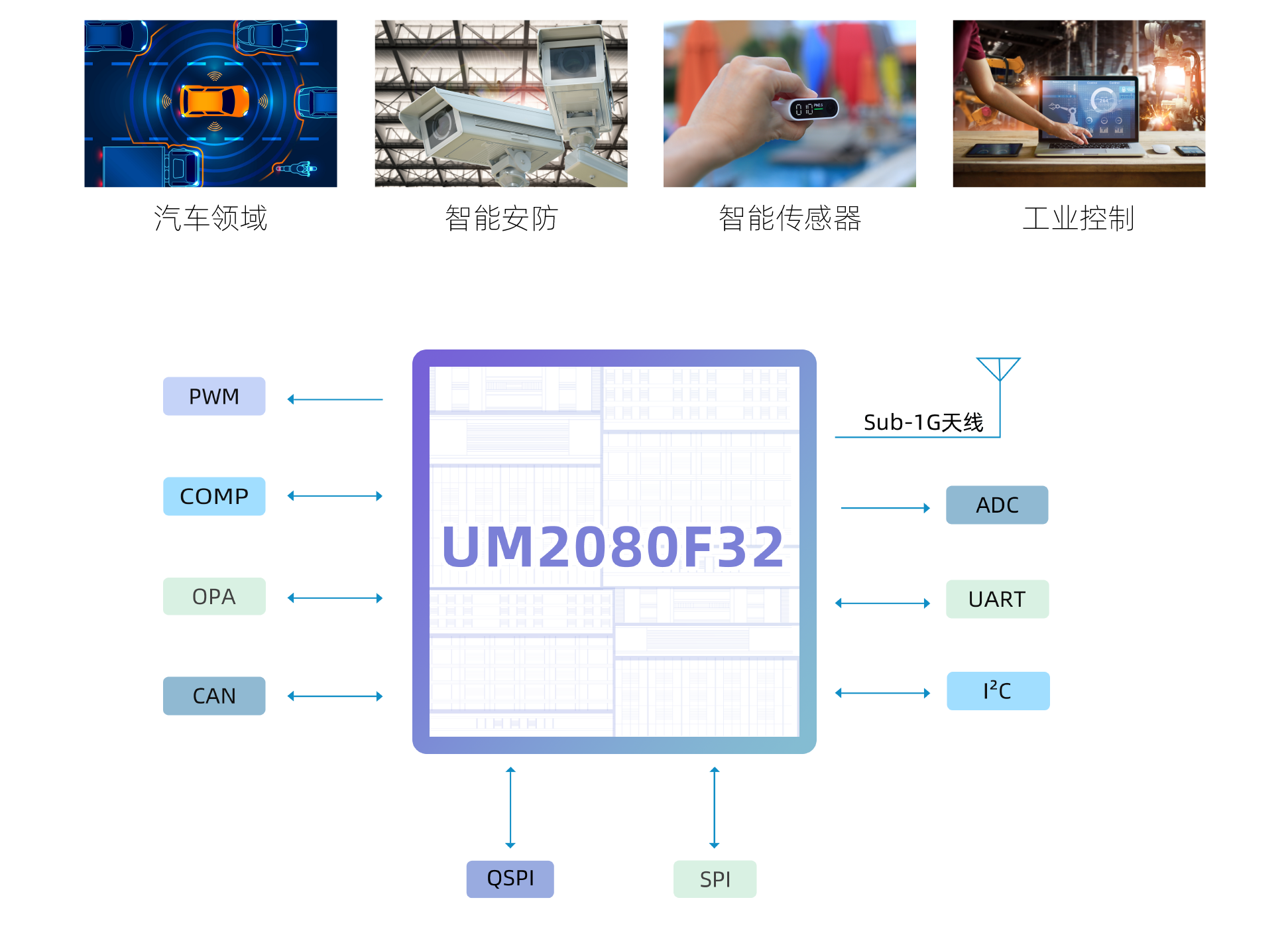 UM2080F32外部搭配通用標(biāo)準(zhǔn)振蕩器晶體,外圍零件少,整體成本頗具競(jìng)爭(zhēng)力,適用于智能協(xié)議控制的節(jié)點(diǎn),或者小網(wǎng)關(guān)等多種智能化應(yīng)用場(chǎng)景;可應(yīng)用在汽車,工業(yè)控制、智能安防、倉(cāng)儲(chǔ)物流、傳感與表計(jì)、智能家居、智能照明等低功耗廣域網(wǎng)應(yīng)用場(chǎng)景。