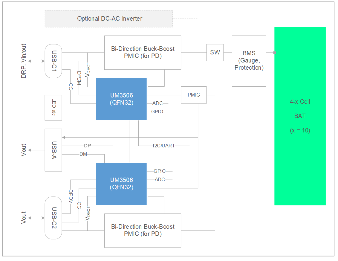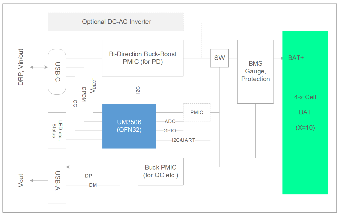 廣芯微旗下雙向PD快充控制器芯片 UM3506 (TID: 2465), 采用軟硬結(jié)合的靈活可編程架構(gòu),全面支持PD3.1 SRC, SNK 及雙向DRP功能,其中包括SPR下的PPS和EPR下的AVS動(dòng)態(tài)電壓模式,同時(shí)還可支持EPR線纜中PD 3.1 EMARK模式。